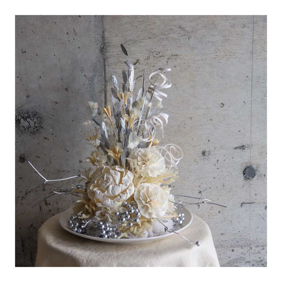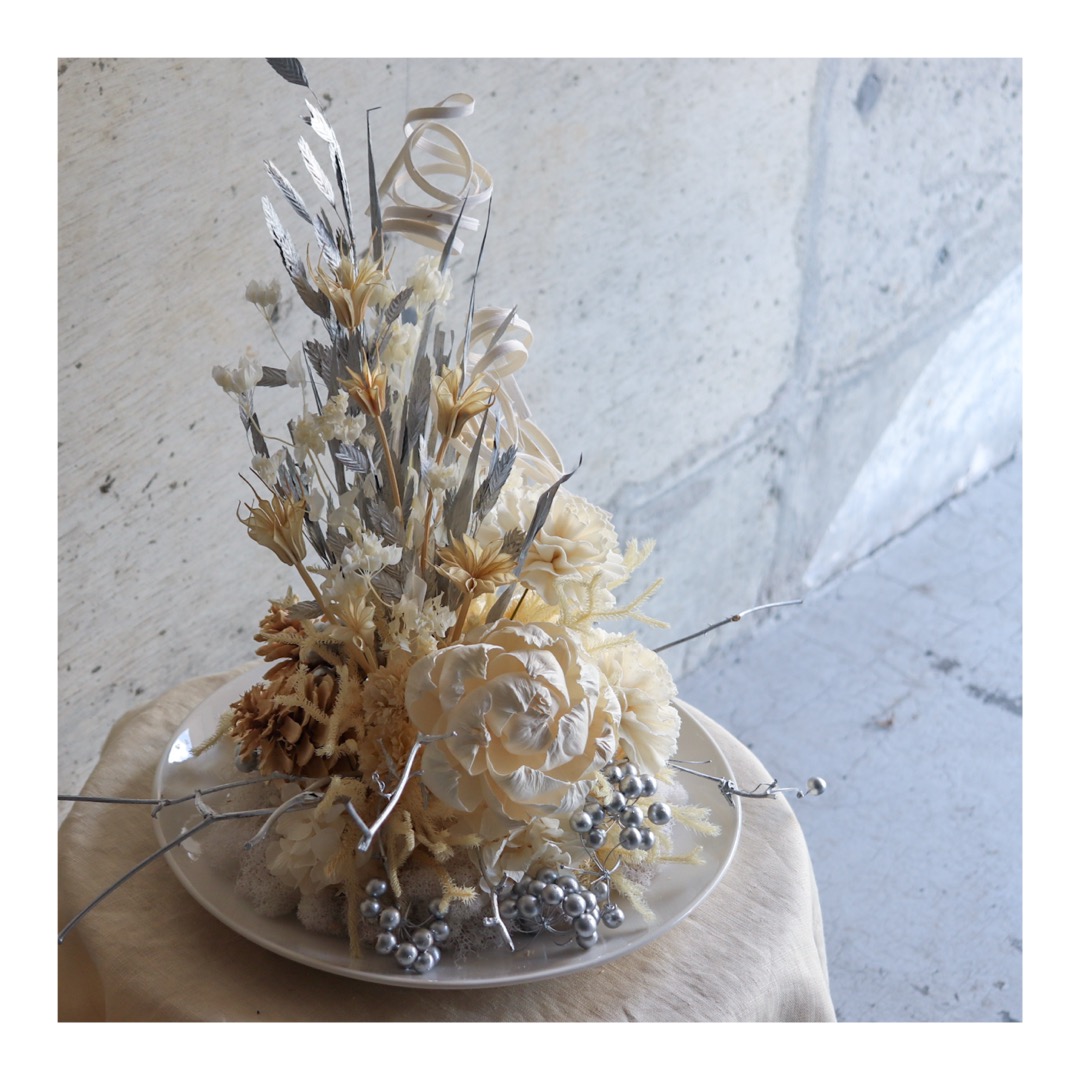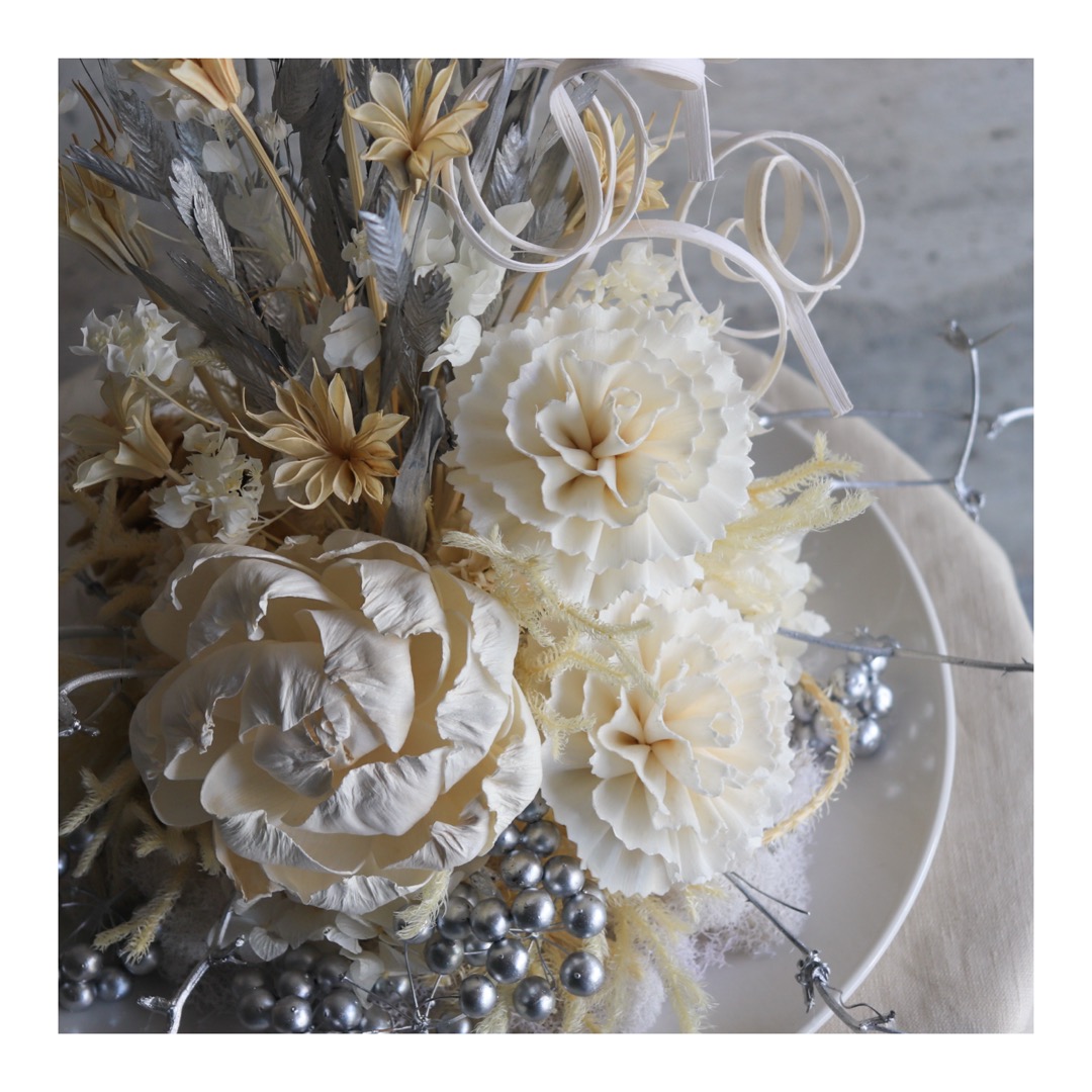 ドライフラワー、ハンドメイドフラワーをひとつひとつ丁寧に組み合わせ、