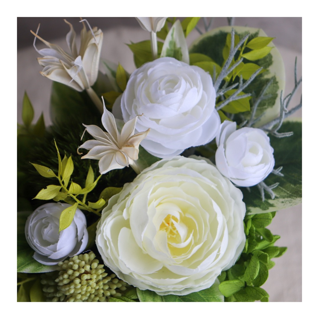 清楚なホワイトのラナンキュラスを主役に、
